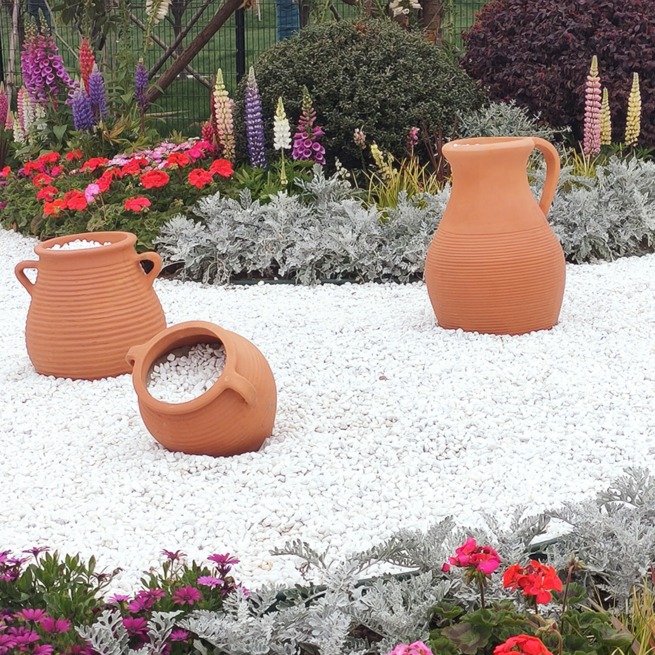 Natural Snow-White pebbles can be used to bring out the more prominent colours you already have in place. Its bright tone is a very simple yet effective way to lighten up gardens, bringing about a far more uplifting feel compared to using darker alternatives.