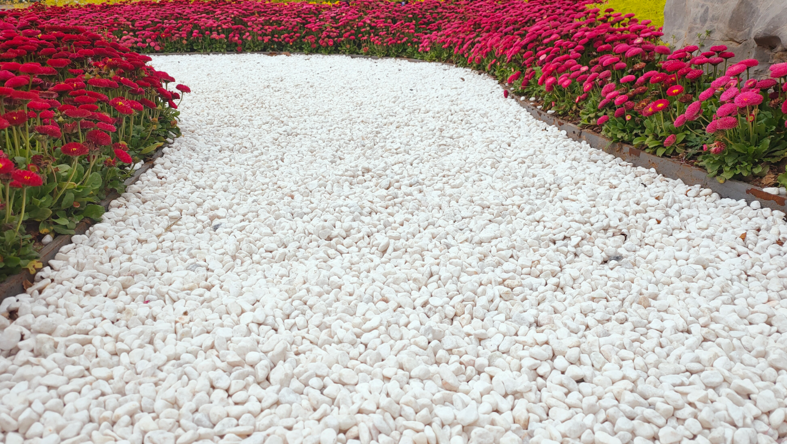 Natural Snow-White pebbles can be used to bring out the more prominent colours you already have in place. Its bright tone is a very simple yet effective way to lighten up gardens, bringing about a far more uplifting feel compared to using darker alternatives.